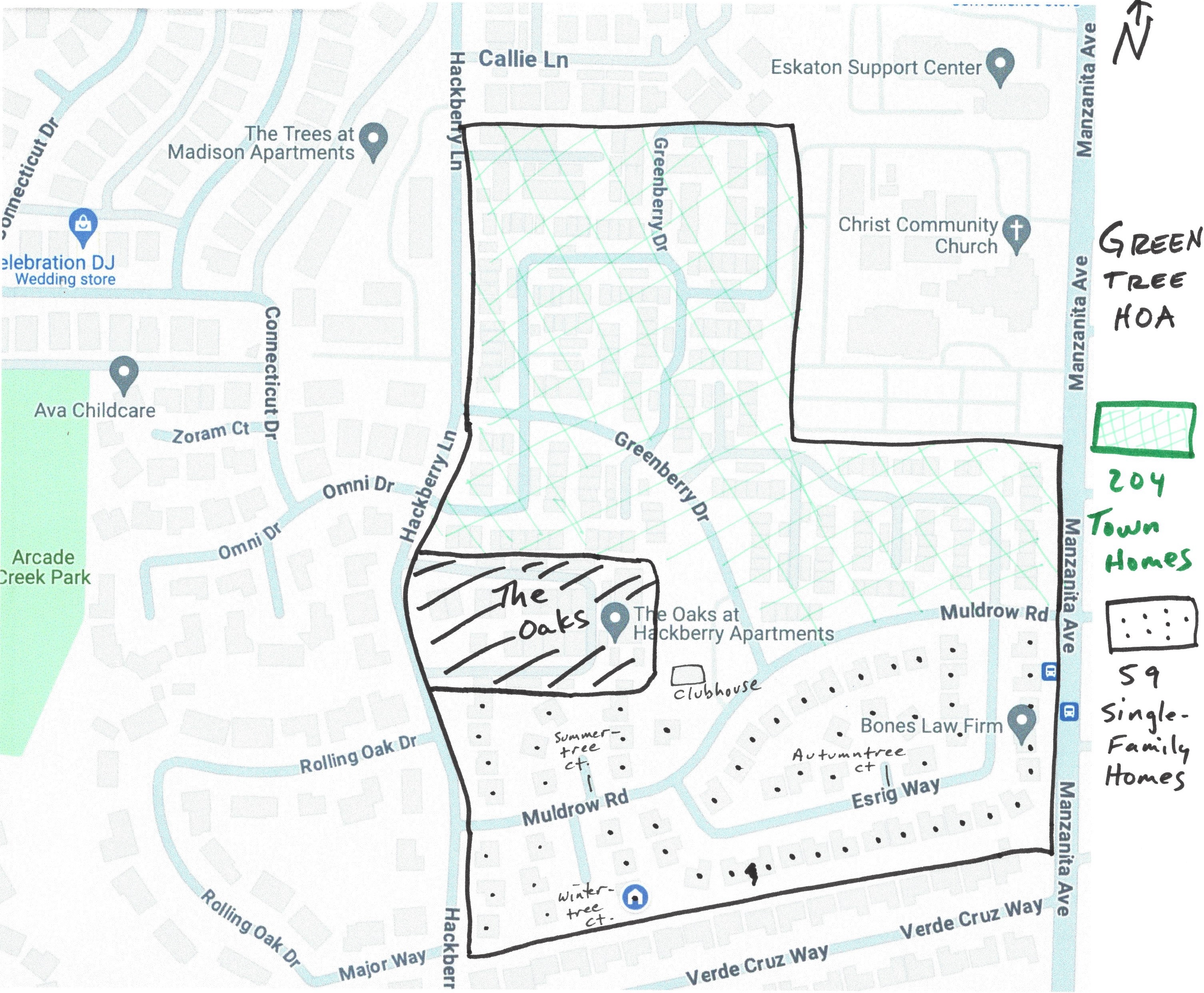 The Green Tree Homeowners’ Association is a community of 203 TownHomes and 59 Single-Family Homes located on Greenberry Drive, Hackberry Lane, Muldrow Road, Esrig Drive; and Summertree, Wintertree, and Autumntree Courts. Here is a basic map.