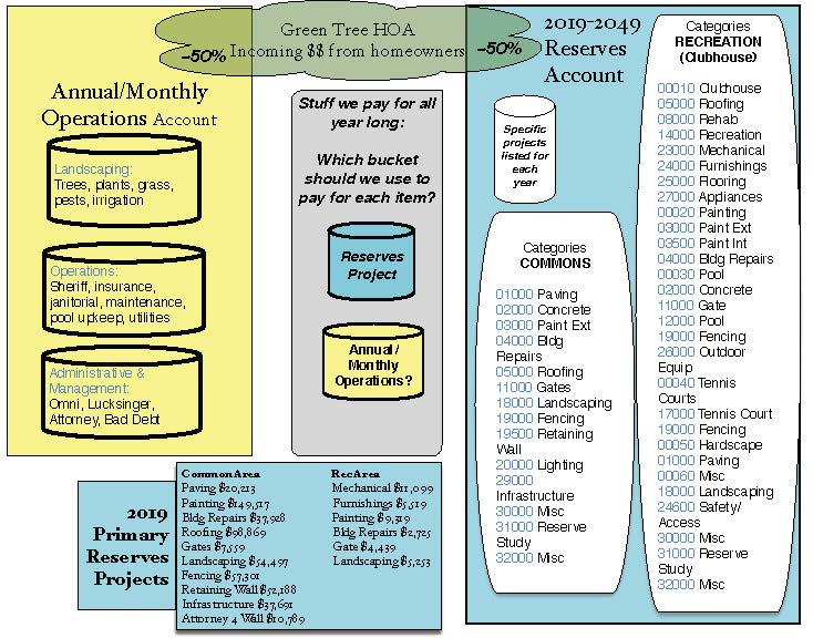 When you look at the Browning reserve Study–BTW there is one complete study for the Rec area and one for the Common area–you see an overview and numerous categories of projects such as paving, concrete, and painting. The diagram below from 2019 was my way of making sense of the way the finances are organized.